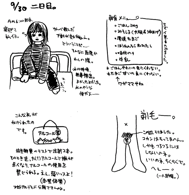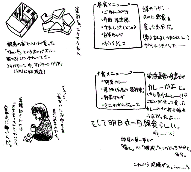 そういえば前日の夜に下剤を飲まされた(前日の日記には未記載)んですが、特に便秘というわけでもないのに全然催さずそのまま就寝