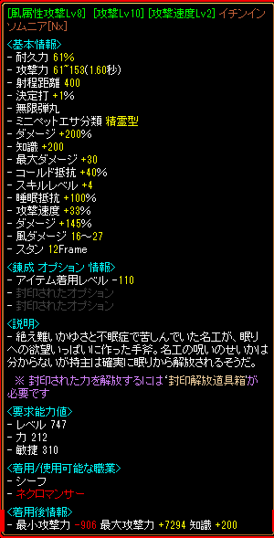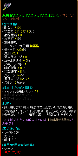 「ヒャッハー☆」とお遊びで速度抽出+貼り付けにチャレンジしてみたら成功してしまったので、ある程度お金が貯まったらダメエンチャ+風属性攻撃で育てて、Nx化して使おうと。